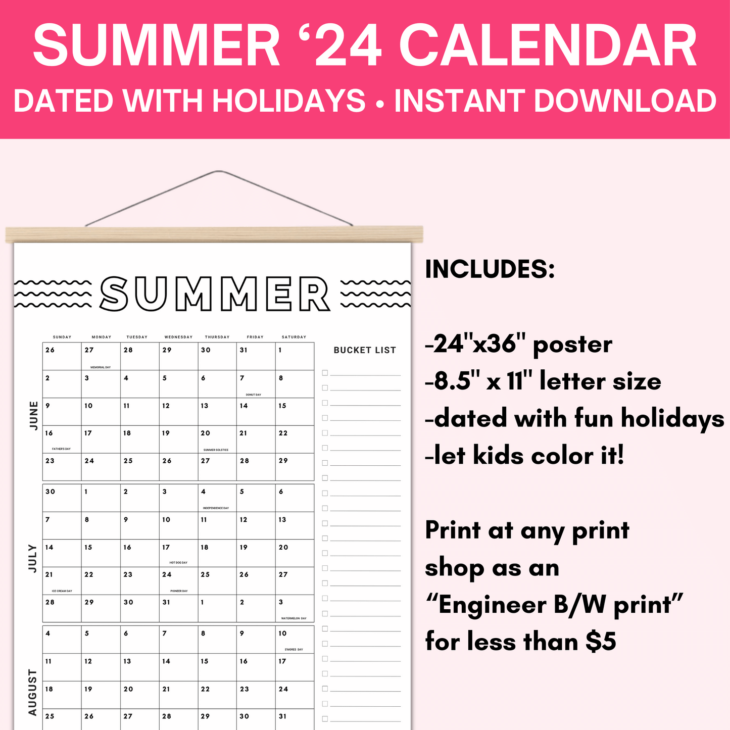 Summer 2024 Bucket List Calendar Poster Dated and holidays